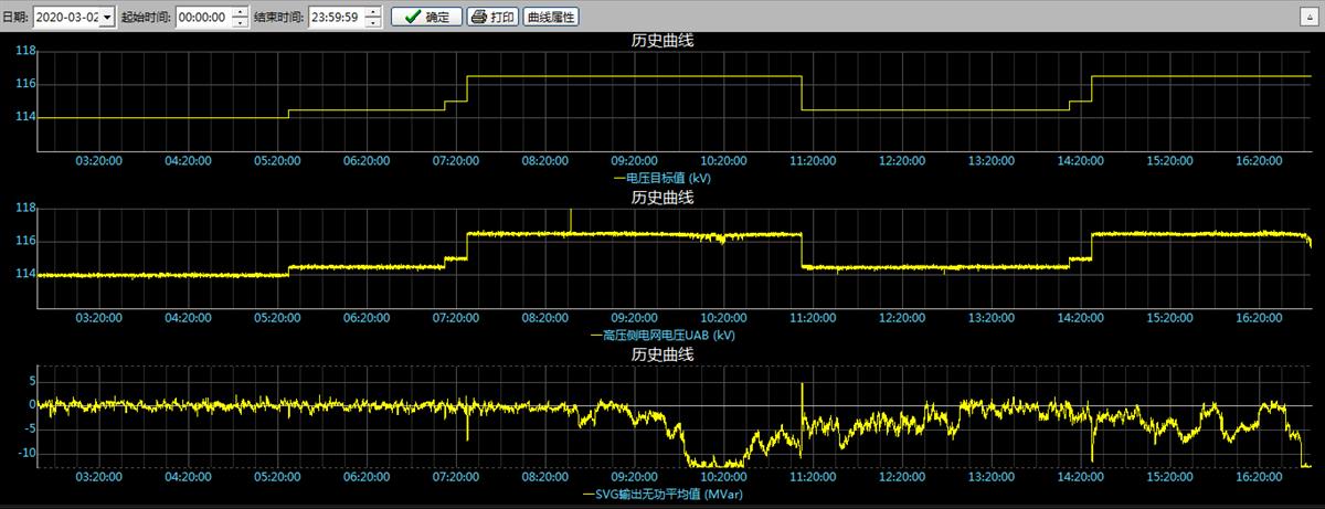 圖1.2中所示分別為電壓指令設(shè)定值(該指令由AVC系統(tǒng)給定)、系統(tǒng)實(shí)際電壓以及SVG輸出的無(wú)功功率。